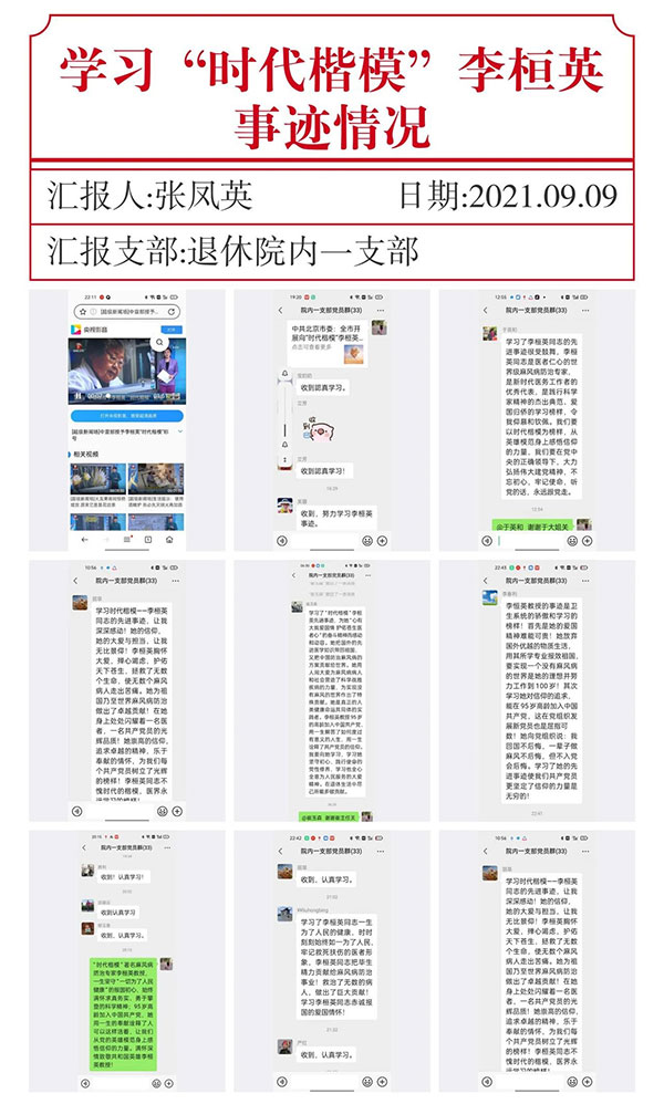 8月20日,中共中央宣传部授予李桓英同志“时代楷模”称号,全社会掀起了向李桓英同志学习的热潮,北京胸科医院离退休党支部积极响应北京市委发出的关于开展向“时代楷模”李桓英同志学习活动的号召,组织党员以支部微信群内集中学习的方式开展学先进,争先进,做表率活动,党员同志们将学习后感想体会分享在党支部群内,展开了热情洋溢的讨论。