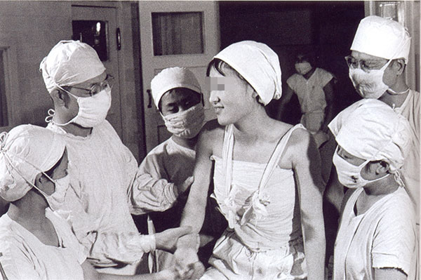 1979年1月13日, 一位30岁的女性患者,患有双侧损毁肺、左侧脓胸,危及生命。入我院后,胸外科专家集体会诊讨论,确定实施肺移植手术方案,手术由辛育龄主任主刀。参加手术的人员分为两组,一组实施常规的全肺切除术,另一组实施肺移植术。手术紧张有序的进行着,在麻醉、血库等科室的通力合作下,术者将白润似海绵一样的肺组织移植在患者的胸腔中,当开放血循环的瞬间,一起一伏的肺组织立即在胸腔内变得鲜活红润,手术获得成功。