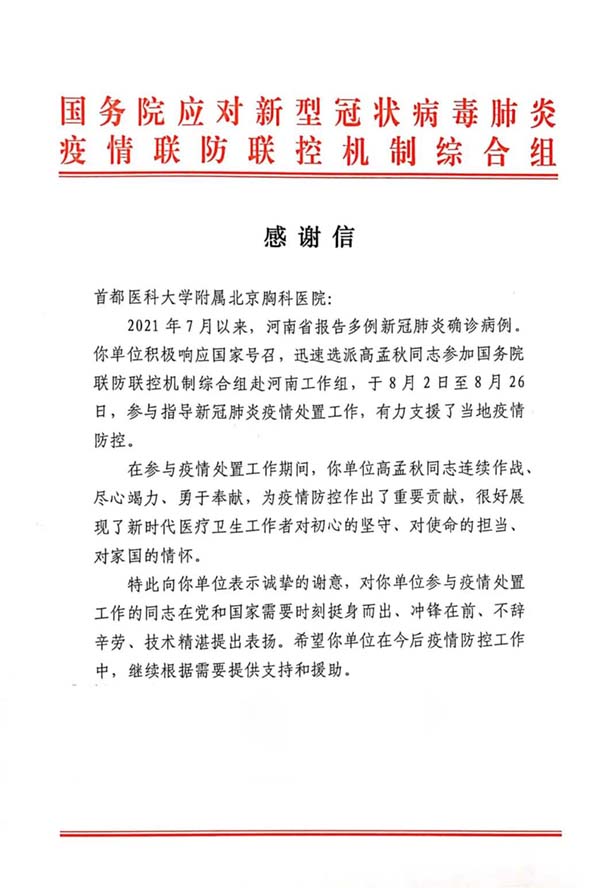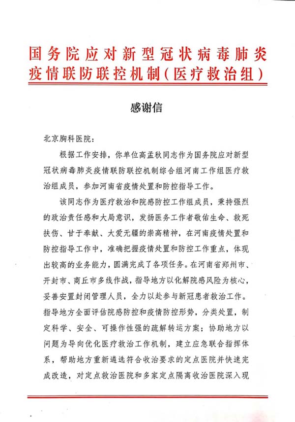 “特此向你单位表示诚挚的谢意,对你单位参与疫情处置工作的同志在党和国家需要时刻挺身而出、冲锋在前、不辞辛苦、技术精湛提出表扬。”看着表扬信上的内容,高孟秋说,从毕业起,她就成为了胸科大家庭的一员,在前辈的教导下从一名年轻的医生成长为一名有经验的专家,在国家需要的时候能够发挥作用,她深感荣耀。30年来,医院的一草一木、一物一景、一人一事都在她的心里,她希望永远生活在这个家庭里,做一个普通的医务工作者,在北京胸科医院这个平台上,为结核病的控制做出自己的贡献。
