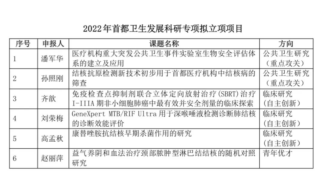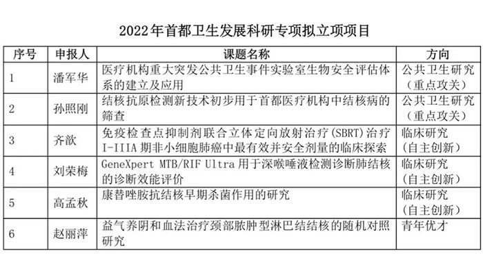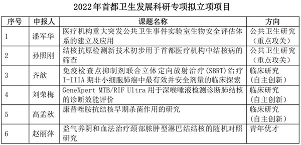 北京胸科医院六个项目获得“首都卫生发展科研专项”立项资助
