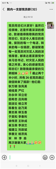 离退休党员关注着疫情的发展,时刻听从党的召唤。得知习主席等中央领导带头捐款用于抗击新冠肺炎,很多老党员向党组织表达了捐款意向。接到医院党委捐款通知后,大家都积极踊跃参加捐款,奉献自己的一份爱心。由于疫情,这次的捐款需要在网络上进行,同样没有难倒老同志!有人正在患病期间,因不会使用微信等网络工具,表示次日儿子回家后捐款,支部书记劝其自己身体患病也需要用钱,心意到了即可,但她执意要表达爱心。有人请儿媳、女儿、儿子代他们捐款;更有人通过电话联系有微信支付功能的同志,先代他们捐款,待疫情结束后方便的时候归还……党支部转发捐款的微信通知已经是晚上十点多钟了,马上就看到老党员捐款的回复,在非常时期,想尽各种办法表达爱心和对抗疫工作的支持。