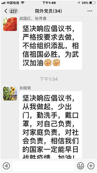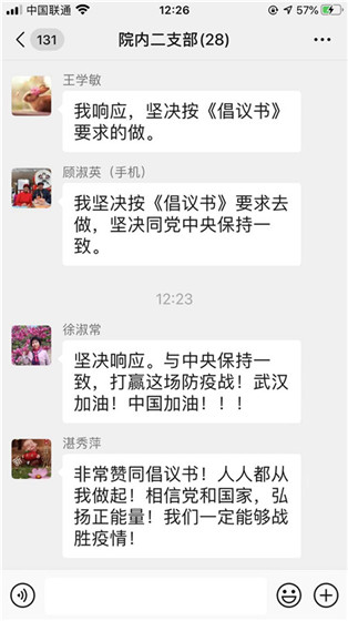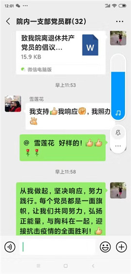 为贯彻落实习近平总书记关于疫情防控的重要指示精神,响应北京市委、市政府及医院相关新冠肺炎疫情防治工作部署,发挥基层党支部的战斗堡垒作用和党员的先锋模范作用,响应北京市委组织部发出的行动令,离退休6个党支部向全体离退休党员同志发出倡议:面对疫情,提高政治站位;主动担当,发挥模范带头作用;依法依责,加强微信群管理;共抗“疫”情,共产党员争先。倡议一经发出,老党员们反响热烈,纷纷表示坚决听从党中央的领导,与党中央保持一致,从我做起,弘扬正能量,对国家负责,对社会负责,对家庭负责。在疫情面前,在这没有硝烟的战场,同样考验着每一位共产党员。