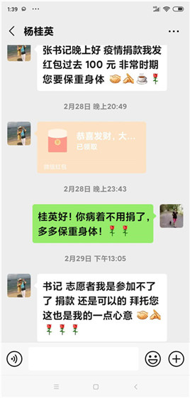 身患腹腔肿瘤还在治疗卧床的杨桂英发来了微信:“书记,志愿者我是参加不了,捐款还是可以的,拜托您,这也是我的一点心意”。我告诉她,你病着可以不捐的,她说您一定得收下,此时,我唯有感动的收下。