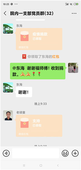 2月29日这个最难忘的夜晚,也是退休院内一支部党员微信群最活跃的时间。在转发党办“为方便离退休党员,可以现金捐款,支部进行登记上报”的通知后,我支部最感人泪目的瞬间至今让我激动不已。