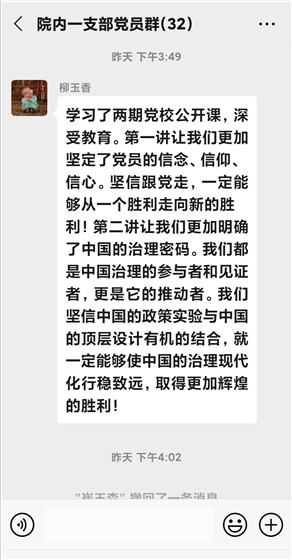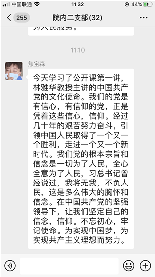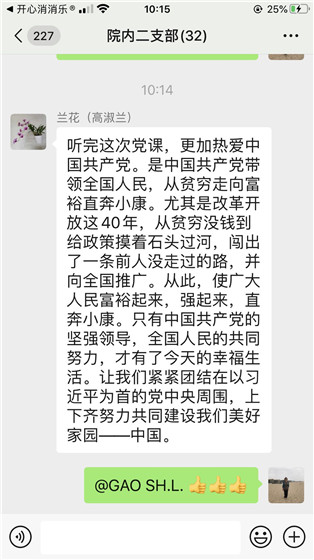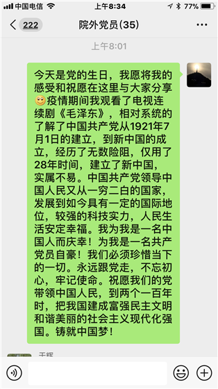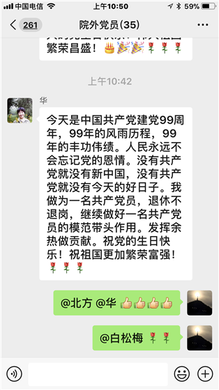 新冠肺炎疫情的发生,打乱了人们的正常工作和生活,为保证疫情防控与支部学习两不误,离退休6个党支部按照所党委年度工作要求组织党员开展线上学习活动为党庆生,通过“学习强国”平台“党校公开课”的内容进行学习并在党支部微信群中将自己的心得体会、所思所想以及想对党说的心里话等进行交流分享。通过自我学习自我教育,激发了老党员们不忘初心使命,继续勇往直前的责任担当。