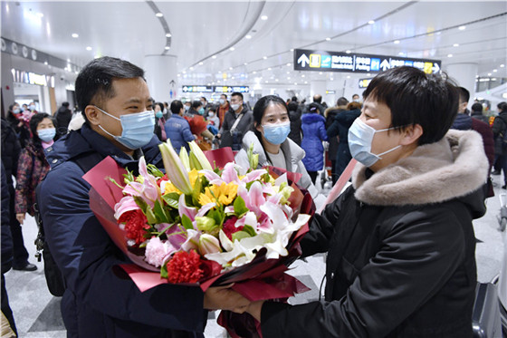 2021年1月16日,北京市第十批第一期援疆医疗队成员圆满完成援助任务,市卫生健康委干部人事处副处长智利平同志、市医管中心组织与人力资源管理处副处长朱晓瑞同志到机场迎接慰问。我所院骨科主任医师兰汀隆同志作为成员之一随队返京,党委副书记李艳红同志带领兰汀隆所属党支部书记、科室主任,以及党委办公室、医务处、宣传中心等职能处室,与兰汀隆家人一同到机场欢迎他回家。