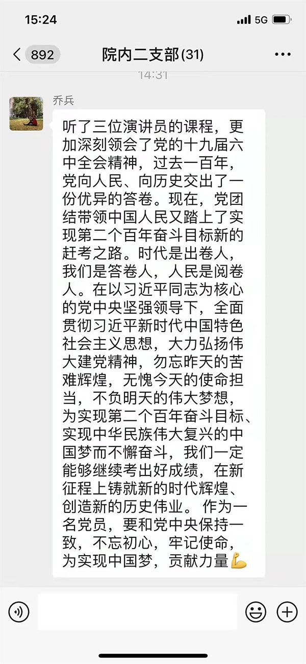 院内一党支部副书记耿万明:从我们党的百年历程来看,我们党无时无刻都经历着考验。作为世界上最大的政党出现一些腐败现象是不容忽视的,对于腐败现象必须严惩不怠,我们的党毫不手软的做到了这一点。不管当今世界如何风云变幻,我们党始终站在战略的高度,把人民的利益放在第一位。祝我们的党越来越好,人民生活越来越好。