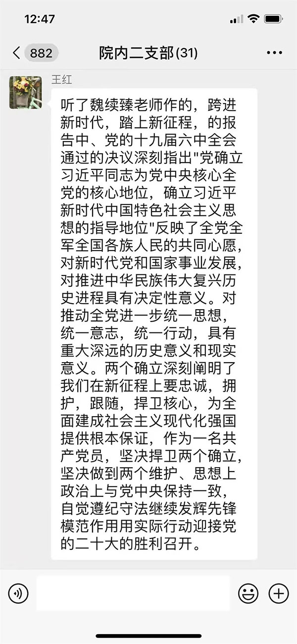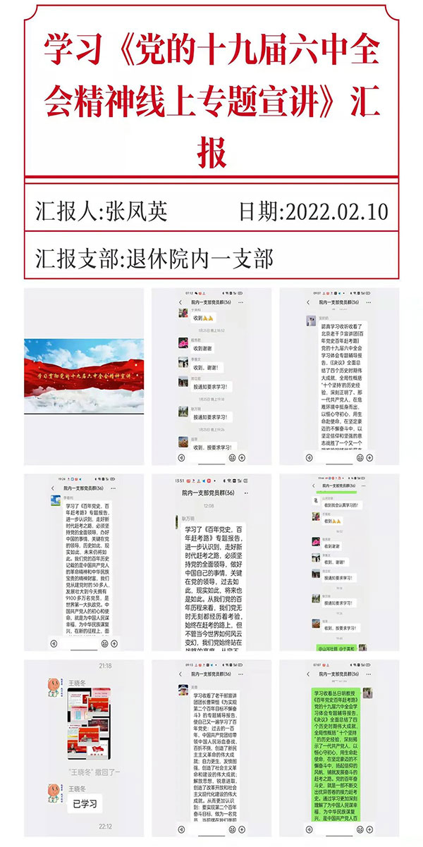 2022年1月25日—2月10日,北京胸科医院积极组织离退休老同志参加北京市委老干部局利用“北京老干部”APP平台举办的学习贯彻党的十九届六中全会精神线上专题宣讲活动。离退休老同志以居家线上自主观看并在微信群分享感想的方式进行了学习,大家感受颇深。纷纷表示通过学习更加深刻地认识到,一是中国共产党的初心和使命就是为中国人民谋幸福,为中华民族谋复兴。走好新长征赶考路,必须对党忠诚,坚持党的全面领导,从党的奋斗中汲取前进的力量。二是实现第二个百年奋斗目标,要紧密团结在党中央周围,统一思想,统一行动,办好中国自己的事情,关键在党。在新的赶考路上,我们党始终把人民的利益放在第一位,把人民对美好生活的向往作为党的奋斗目标。三是党的百年奋斗史就是一部不断交出优异答卷的接力赶考史,每一名党员都是赶考者和答卷人,激励党员在新的赶考路上初心不改,永跟党走。