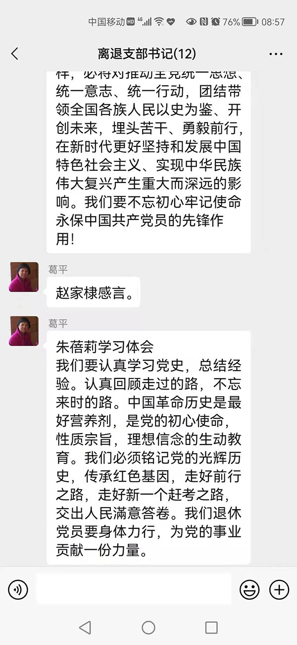 城南党支部委员李燕申:党在新形势下的领导定位,是中国人民的一致选择,是众望所归。我们作为党员,必须要珍惜党的历史经验,言行一致的维护和拥戴党的绝对领导。我们这些退休党员要做好自己及家庭的事情,不给党添麻烦,与全国人民一道,学党史,颂党恩,了解党的历史定位,自觉团结在党的旗帜下,坚定不移跟党走。