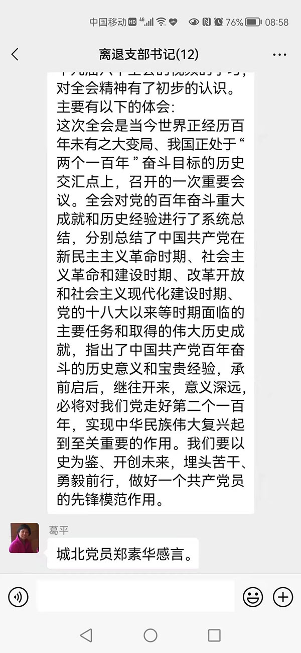 院外通州党支部党员马凤兰:十九届六中全会总结了我党的百年历程,告诉我们要永葆不懈怠的精神状态,以忠诚为魂,忠诚是立身之本,精神是成功之源。通过学习使我更加坚定信念,时刻保持清醒的头脑。不忘初心、牢记使命,退休不退色,永做一名合格的共产党员。