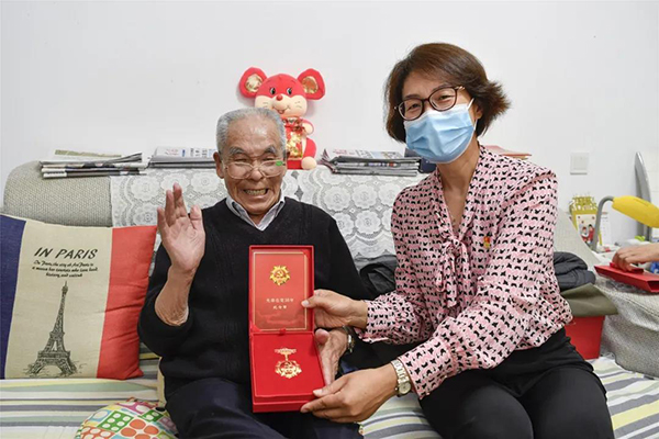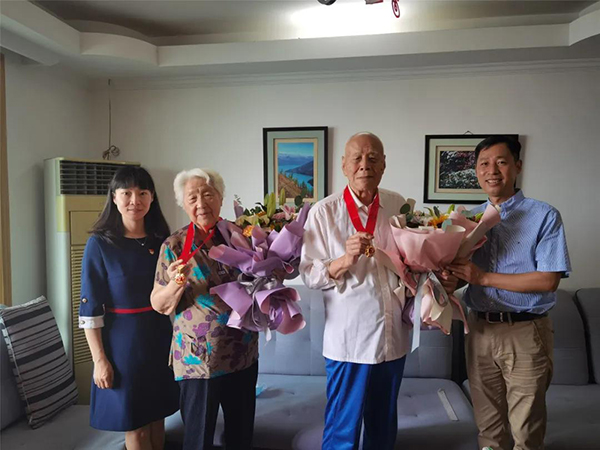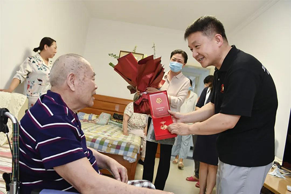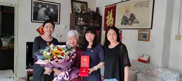 手捧鲜花,将“光荣在党50年”纪念章戴在胸前时,多位老党员激动落泪,无不感叹中国共产党走过百年岁月的不易,生活在党领导下的社会主义中国的幸福与满足。今年87岁、党龄59年的老党员杨秀英手捧纪念章仔细端详,她说:“党颁发给我纪念章,是给我的最高荣誉,我要教育好子女坚定不移听党话、跟党走。”并邀请慰问人员一同唱起了《没有共产党就没有新中国》,这是一个老党员的肺腑之言。
