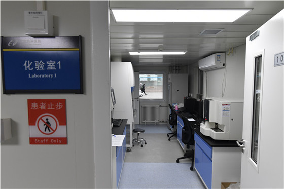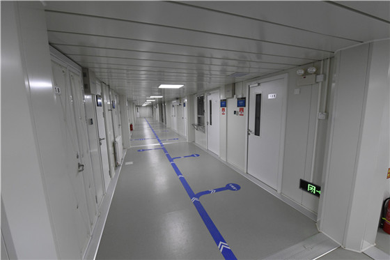该建筑长约87m,宽约15m,建筑面积1298㎡,用地面积2135㎡,建筑高度4.9m,采用类似小汤山医院的集装箱板房设计解决方案,建筑结构安全等级2级,抗震等级更是达到了8级。门诊内严格按照污染区、半污染区、清洁区来进行设计分区。设有2间发热门诊诊室、3间留观病房、一间负压病房、一间负压监护病房;兼备咽拭子采集室、化验室、PCR实验室、CT等功能。