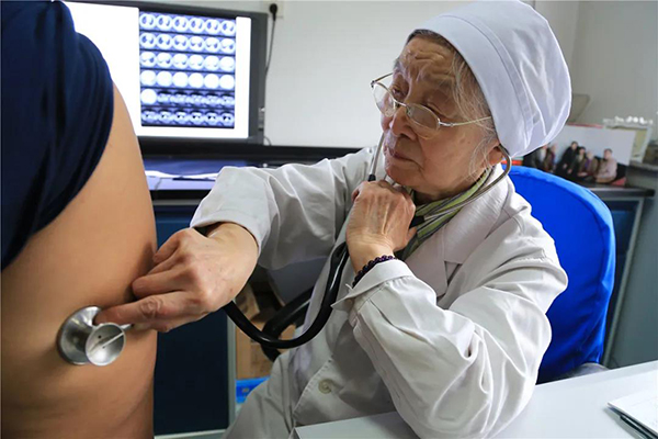 马玙教授一直坚持在岗位上工作,虽然已90岁高龄,但仍坚持每周出诊,状态饱满地为患者服务。马老以一股坚韧的干劲、满腔的热血,几十年如一日的努力工作,为实现终止结核病的目标奉献余热;马老每次听诊前,她都会贴心地用手把听诊器焐热,避免冰凉的听诊器给患者带来不适。表达了她对患者的无微不至的关怀和坚持为患者服务的初心。