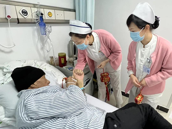 患者家属和我们一起张贴福字,沾喜气,王阿姨说:“春节我们不回家了,这里就像家,和你们一起贴福字沾喜庆!”春节里呼吸科医务人员为患者送去祝福,送福到“家”,看到患者洋溢的笑脸,让他们此时此刻忘记了病痛;和我们紧握的双手,让他们感受到温暖有爱有真情;一句句过年好,让他们不再有家的思念。