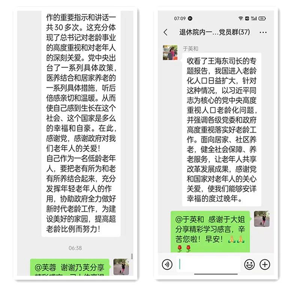老同志收看后发来感言,纷纷表示:党中央和国家卫健委对老年人生活质量提高和养老体系完善的各项举措充分体现了对老龄工作的重视,对老年人的关怀,感到生活在中国很幸福。医院党委对老同志的关怀和慰问更让我们倍感温暖。大家表示要积极响应国家老有所为、老有所学的倡导,保持乐观的生活状态,乐享健康生活的同时,积极支持医院的发展,发挥余热,活出更加精彩的人生!