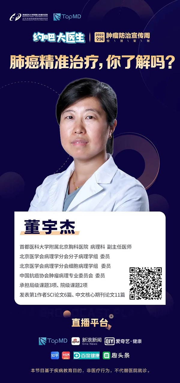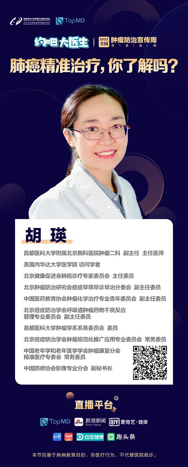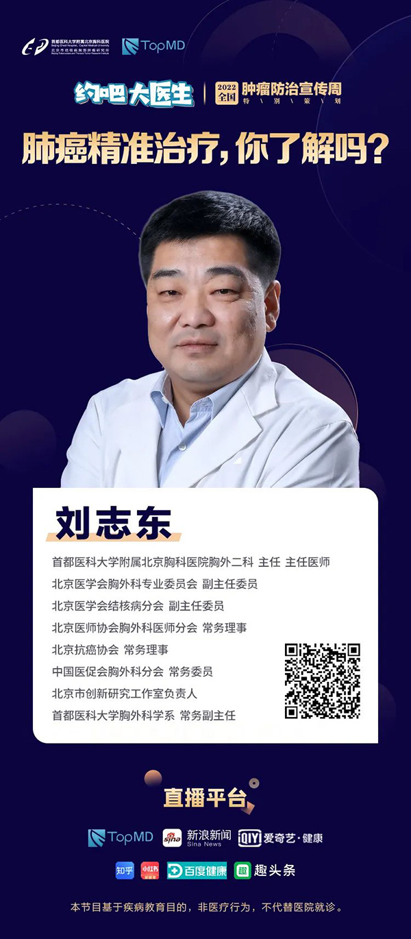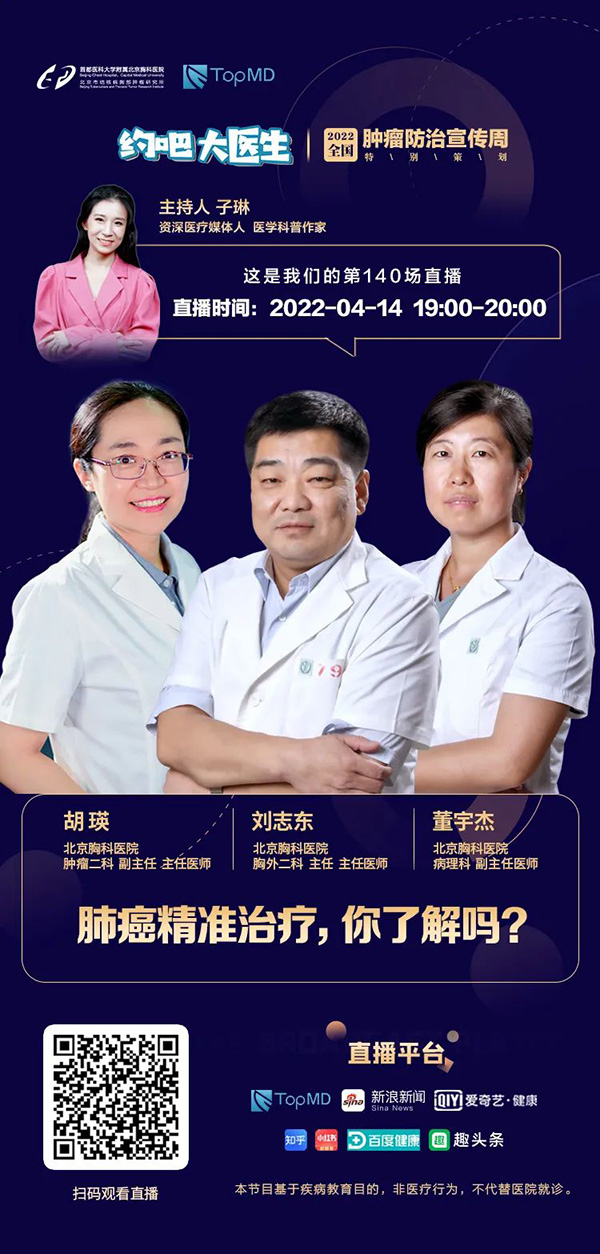 2022全国肿瘤防治宣传周特别节目精彩继续,就在2022年4月14日19:00-20:00,首都医科大学附属北京胸科医院外科、内科、病理科专家共同做客《约吧大医生》直播间,我们将对话多学科,带您了解肺癌的精准治疗,同时解开您关于基因检测、靶向治疗、免疫治疗、淋巴结清扫、各种外科术式的种种疑问。
