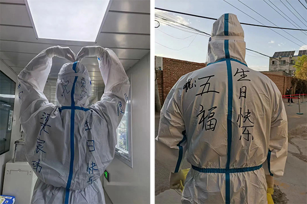 5月18日的早晨,北京胸科医院的发热门诊一如往日的忙碌着,交班、查房、核对医嘱……就在交班快结束时,忽然有人指着办公室的监控显示器说:“咦,这是谁啊?防护服上怎么写着字?”定睛一看,视频监控中一名护士在后背上写着几个大字“梁宸玮,生日快乐”。