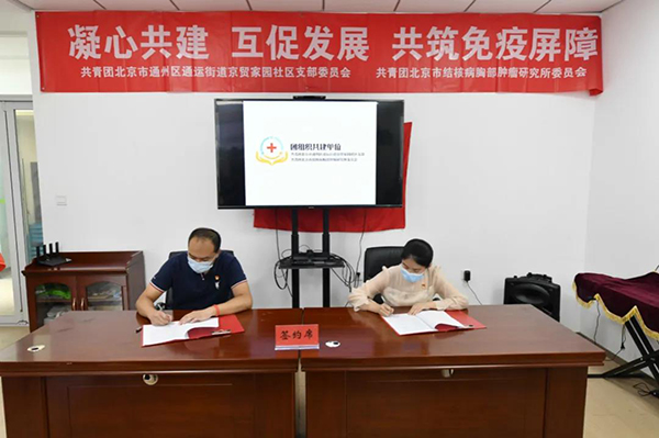 “从今天起,北京市结核病胸部肿瘤研究所、首都医科大学附属北京胸科医院的医生每月都将走进咱们社区,开展一次专项义诊活动,这里将成为北京胸科医院和京贸家园社区的志愿服务实践基地。”7月13日,北京胸科医院团委与通州区通运街道京贸家园社区团支部共同签下了共建协议,两家单位正式成为团组织共建单位。