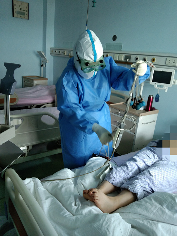 还记得第一次进隔离病区,穿戴防护服就用了将近二十分钟,尽管以前练了无数次,但这次意义非凡,每做一步都要仔细检查。穿好后,我和队友拖着厚厚的防护服终于走进了隔离区。作为一名共产党员,能够战斗在前线,我的内心感到无比激动。然而,对于不熟悉的工作环境,不熟悉的工作流程,更加不熟悉的疫情变化,我也有过紧张害怕。但是,随着一个病房一个病房走过,和病人细心交流,我的内心也开始变得笃定,穿着厚厚防护服的身体顿时也感觉没有那么沉重了,说话也不觉得费劲了。