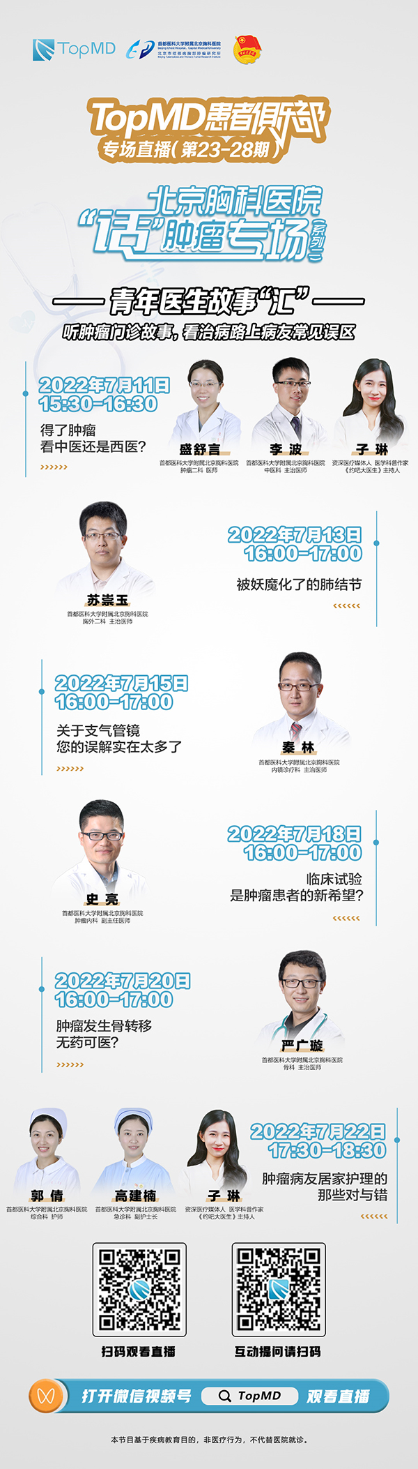 第23场-28场即将开启,就在2022年7月11日-7月22日,应广大病友的要求,我们再次为大家邀请到首都医科大学附属北京胸科医院的专家做客TopMD,本系列直播答疑活动由北京胸科医院团委特别支持,邀请到8位青年专家,从门诊所见所闻的患者故事入手,为大家纠正常见误区、答疑解惑。