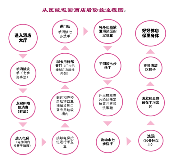 日前,一张由北京胸科医院援鄂医疗队护士彭乐自创的“个人从医院返回酒店后防控流程图”在队内成为焦点,她把整个流程清晰的分成一个个小步骤,从进酒店大厅开始到进入住宿房间,每个环节确保医护安全…